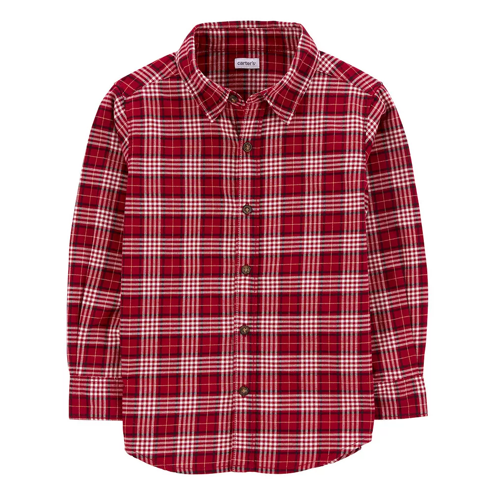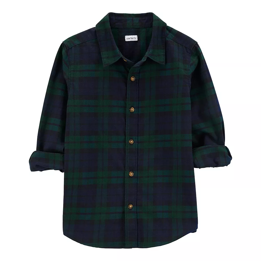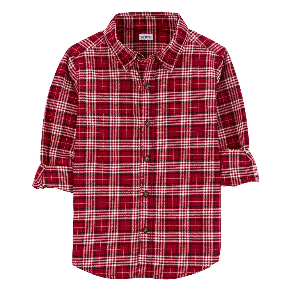 Carter’s ties his look together with this fashionable plaid button-front shirt.