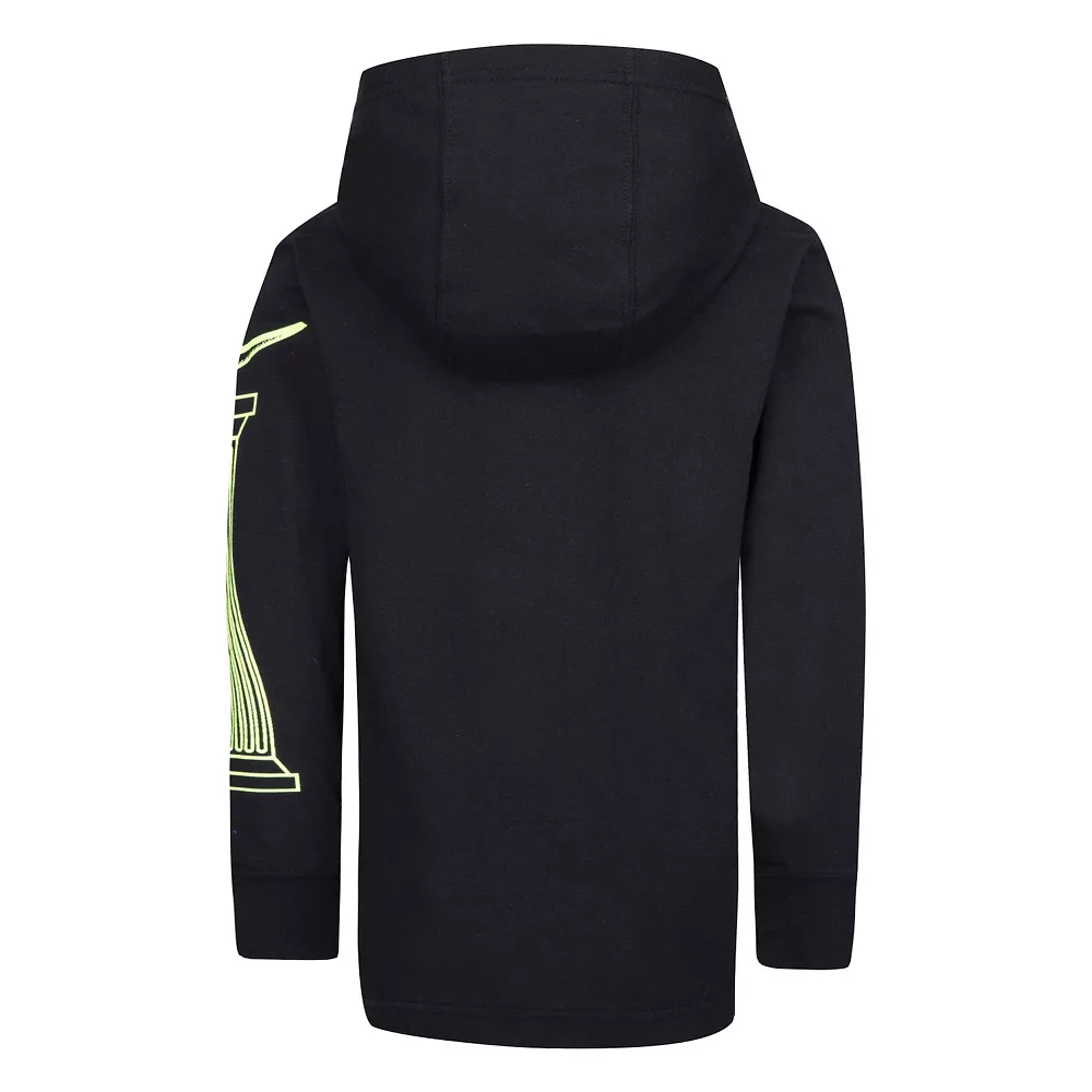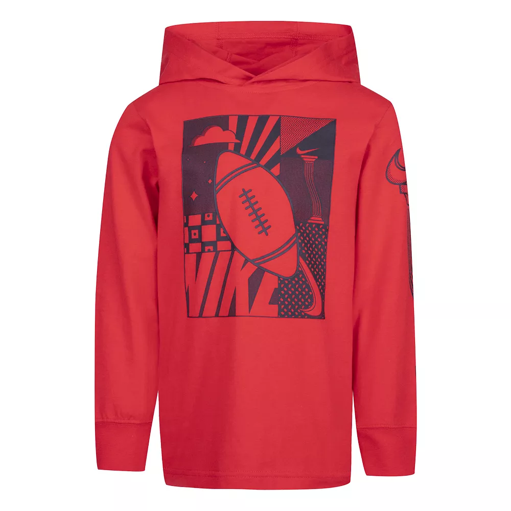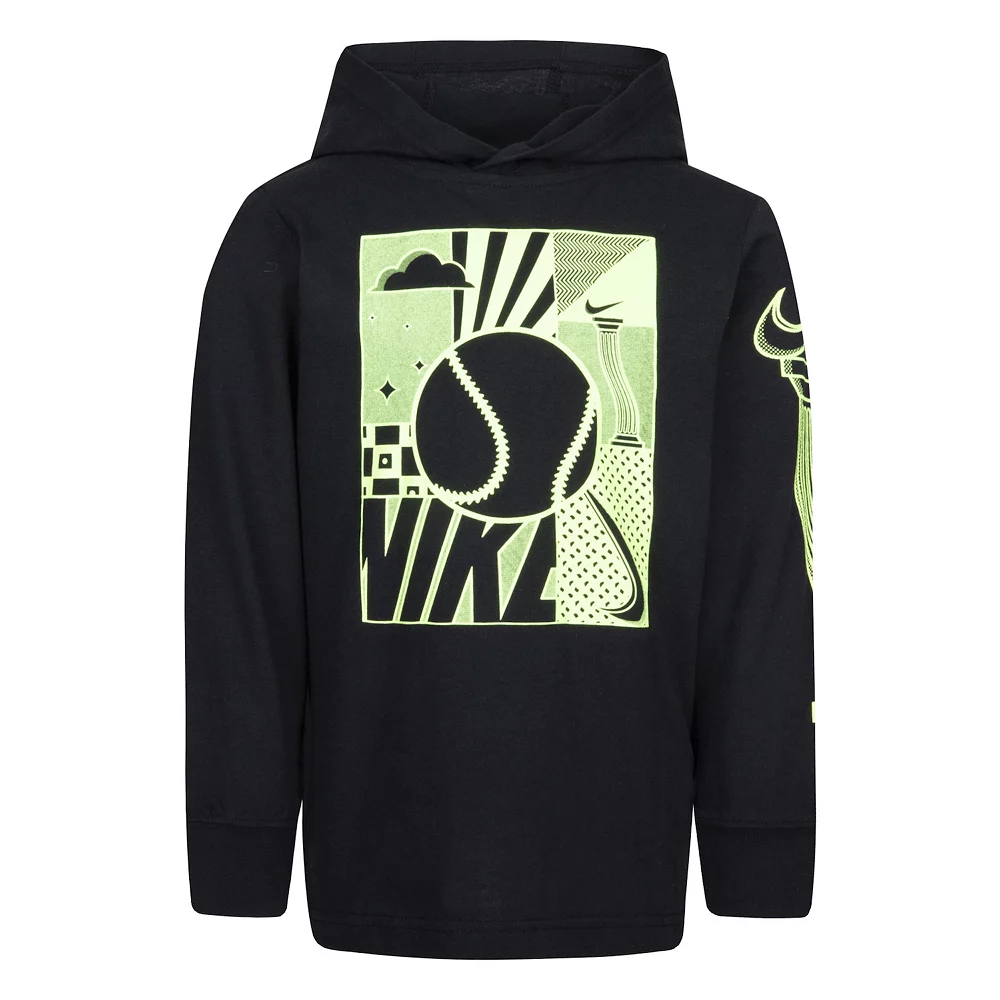Your little athlete will be ready to hit the playground in this boys’ long sleeve hooded graphic tee from Nike.