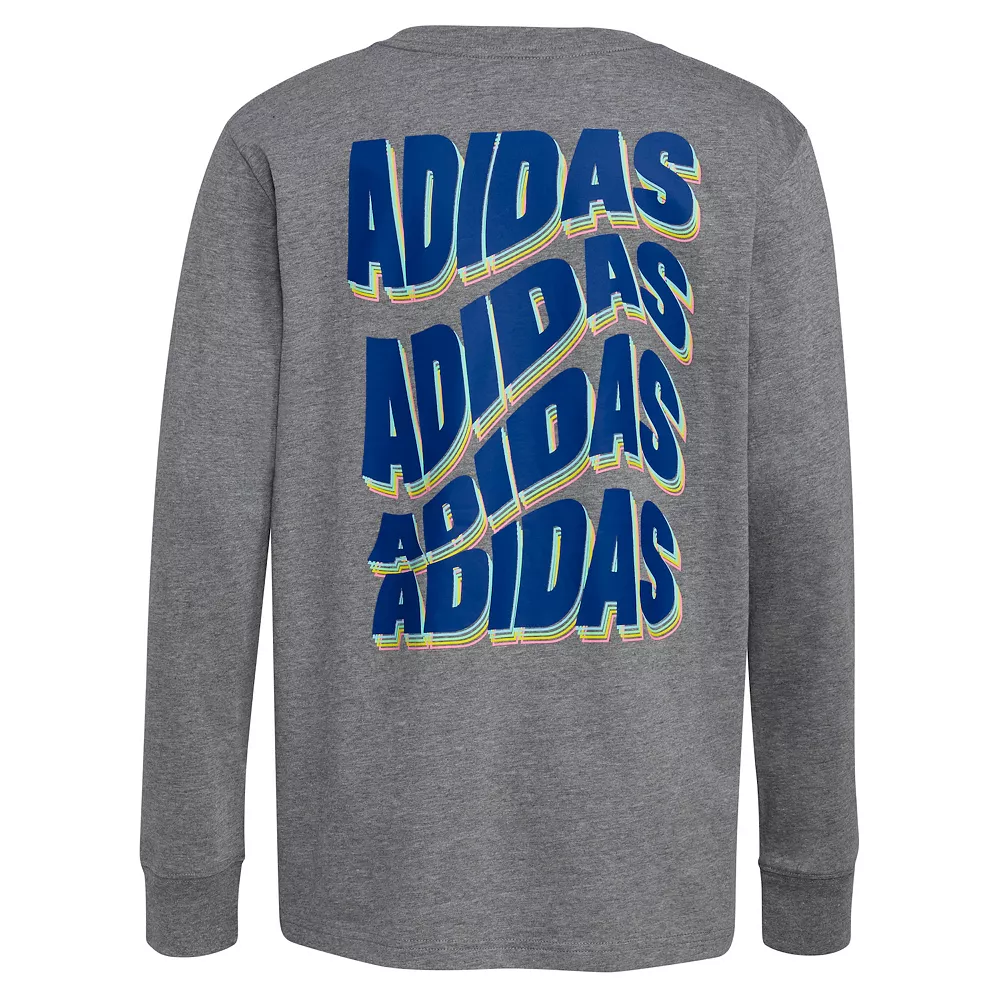 adidas gets wiggly with a ripple graphic on the back of this boys’ long sleeve t-shirt. On the chest, a smiley face peeks out from behind the Badge of Sport logo. The cotton-blend jersey is soft and comfy, and durable enough to wear and wash again and again.