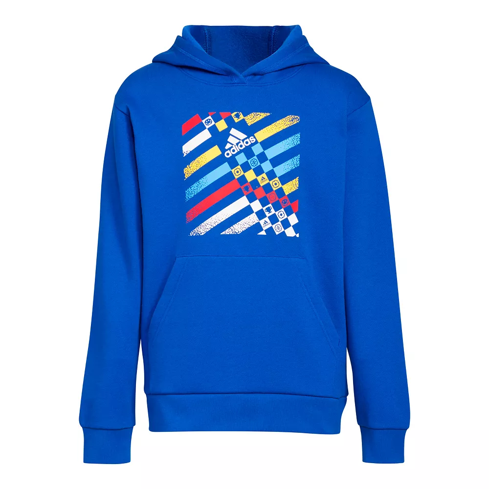Don’t settle for ordinary. Bright colors and geometric details level up the look of this boys’ adidas hoodie. Soft, warm fleece means he’ll be comfortable all day long. Wash it, wear it and repeat.