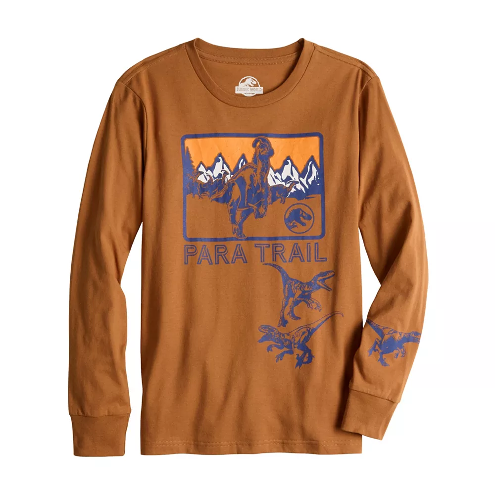 He’ll love showing off his personal style with this boys’ Jurassic Park Dominion Dinosaur Laso Herd Para Trail Raptors Long Sleeve Graphic Tee.