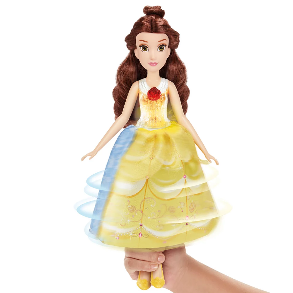 - Kids can transform Belle from one look to the other by just squeezing her legs, making her skirt spin around