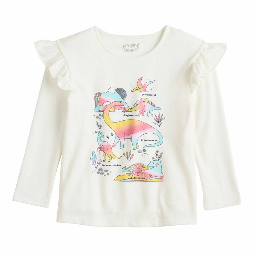 With its sweet ruffled shoulders, this adorable girls’ long sleeve graphic tee from Jumping Beans is sure to be one of her favorites.
