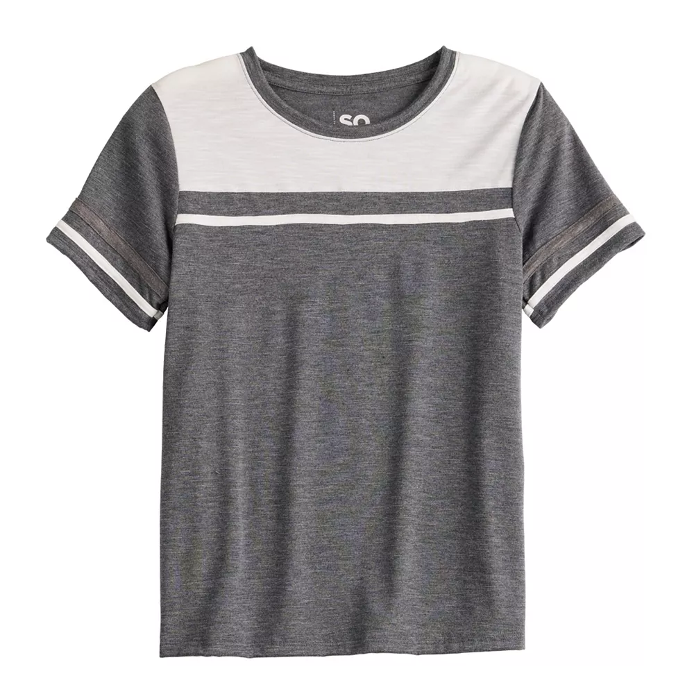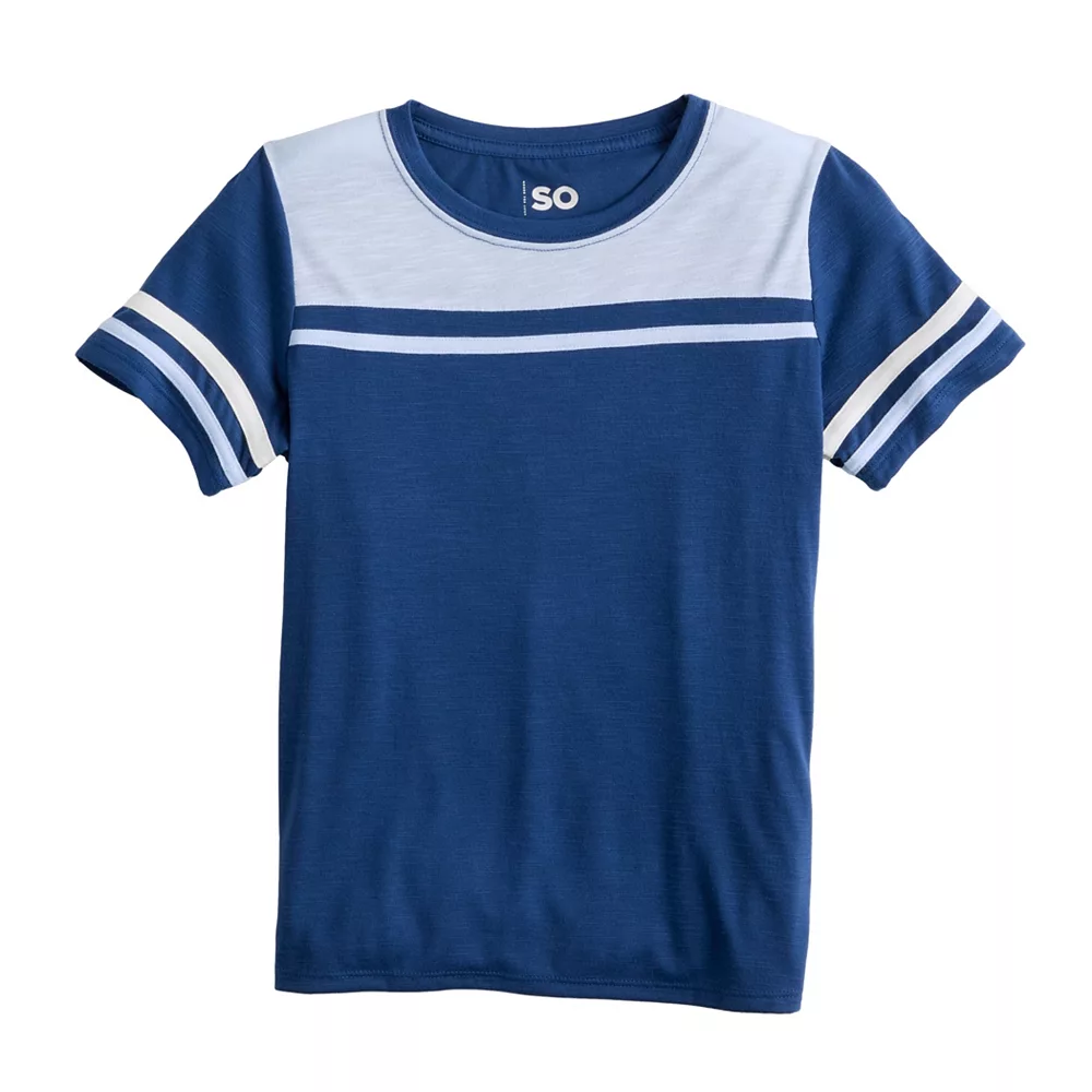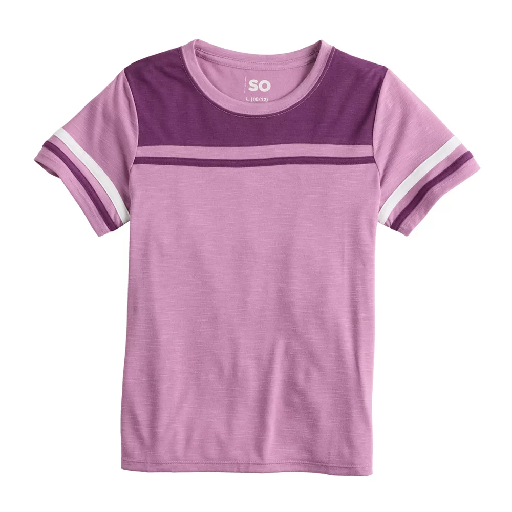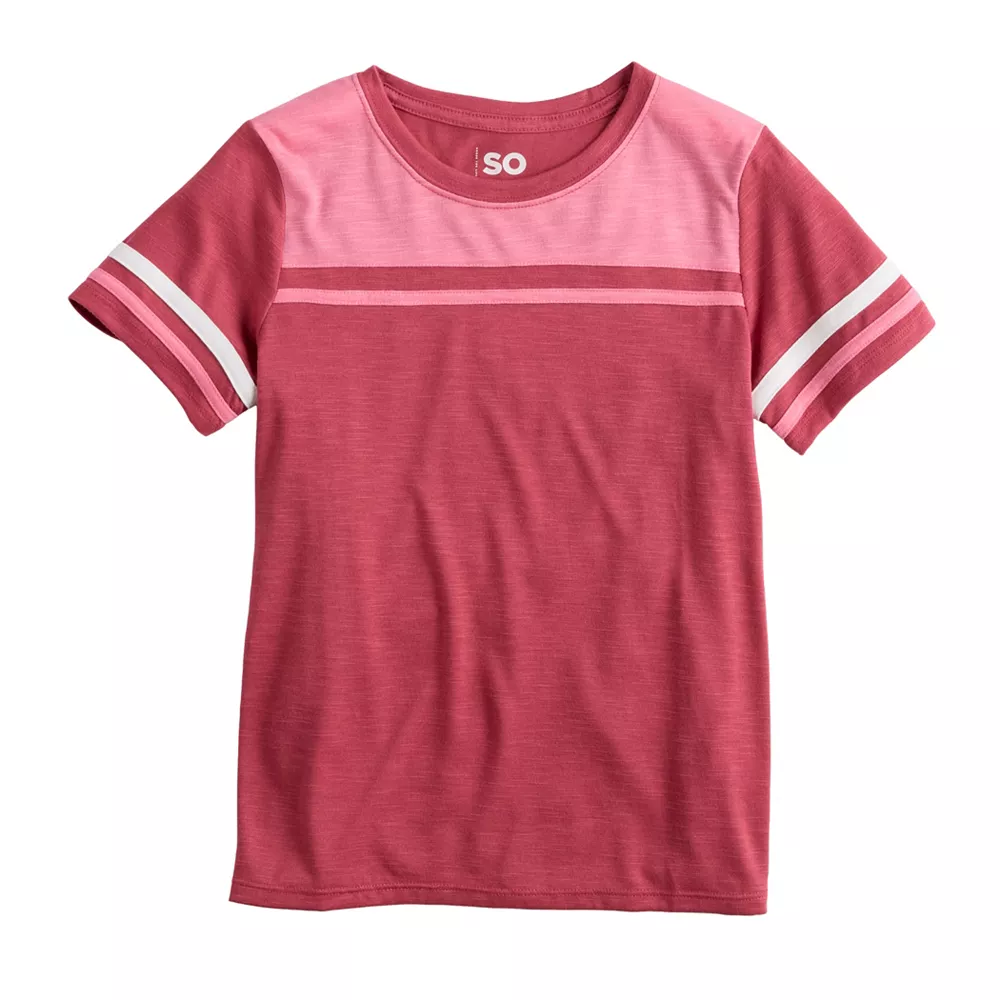 Add a little retro flair to her wardrobe with this girls’ colorblock football tee from SO.