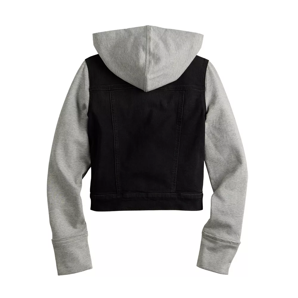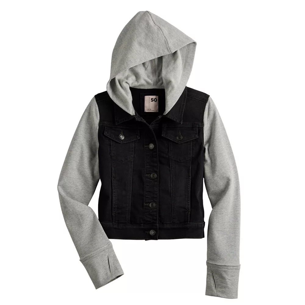 She’ll love her look in this girls’ hooded denim jacket (featuring a cozy knit hood and sleeves) from SO.