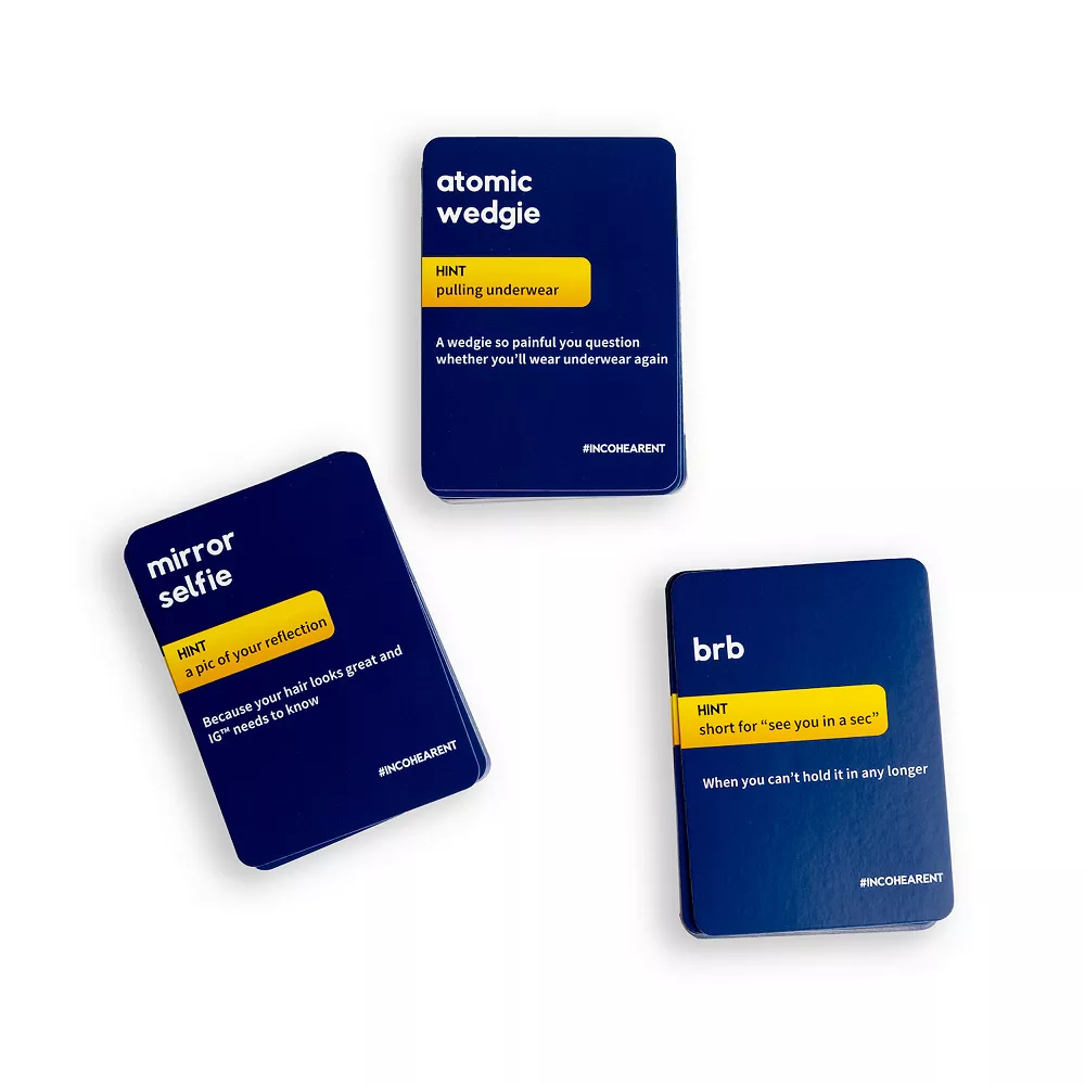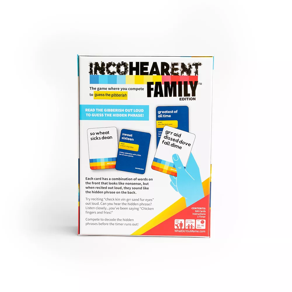 Incohearent is the perfect addition to a hilarious family game night! This version of the hit game has now been made PG for family-friendly hilarity.